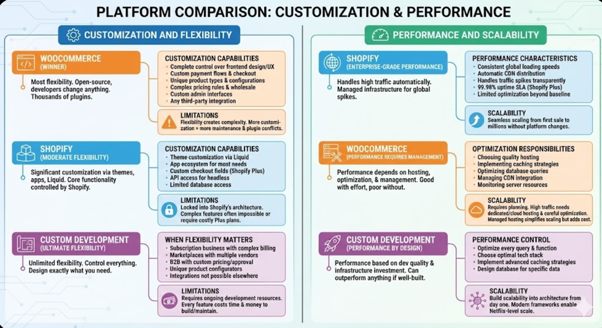 Custom development enables competitive differentiation impossible on off-the-shelf platforms. But most businesses don't actually need custom platforms and waste resources building what Shopify or WooCommerce provides excellently.