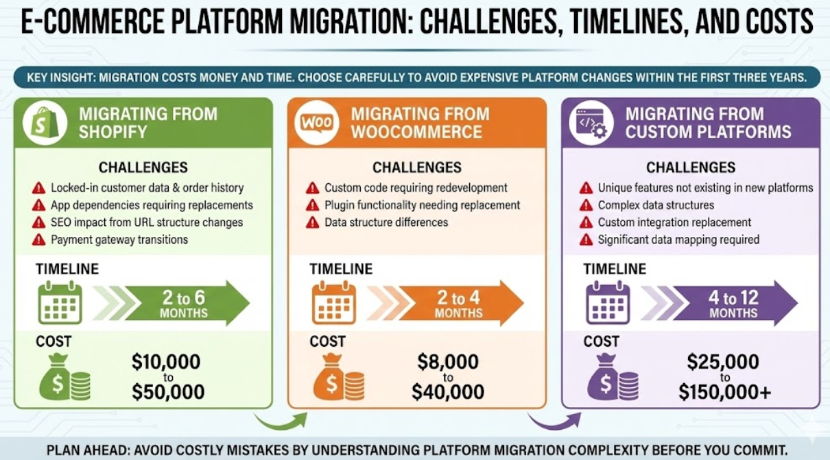 Key Insight: Migration costs money and time. Choose carefully to avoid expensive platform changes within first three years.