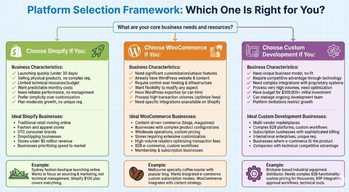 Q: Which e-commerce platform is best for Australian businesses: Shopify, WooCommerce, or custom development?
