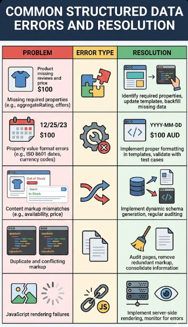 - Schema markup errors often emerge after implementation through CMS updates, template modifications, dynamic content changes, and third-party integration updates requiring ongoing monitoring rather than one-time validation
