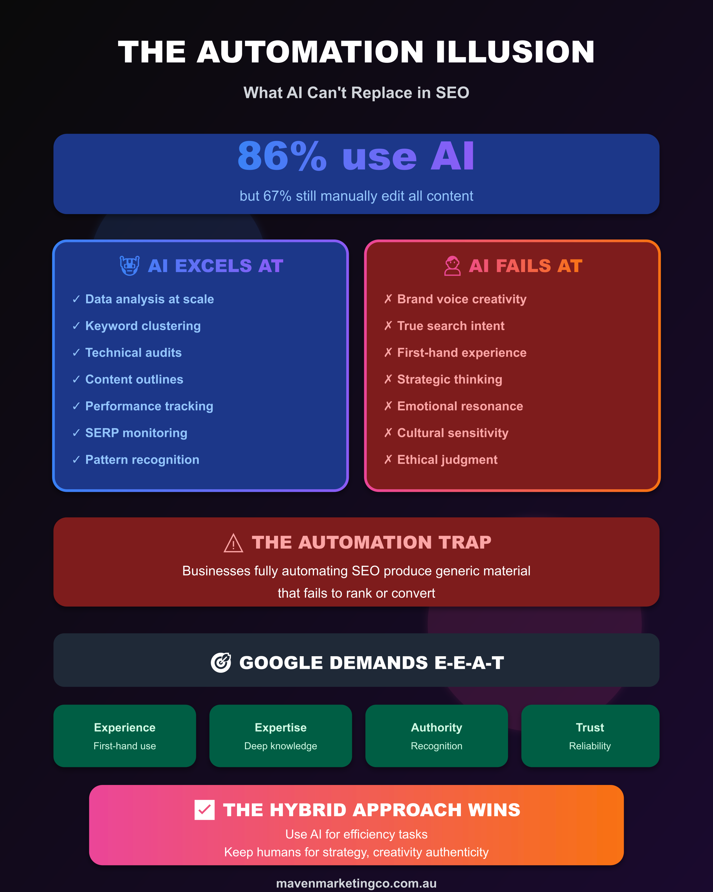 Australian businesses face a choice. Pursue the automation illusion, generating endless generic content that fails to rank and doesn't convert. Or embrace the hybrid reality, using AI strategically for efficiency while investing in the human expertise that actually differentiates successful SEO from wasted effort.