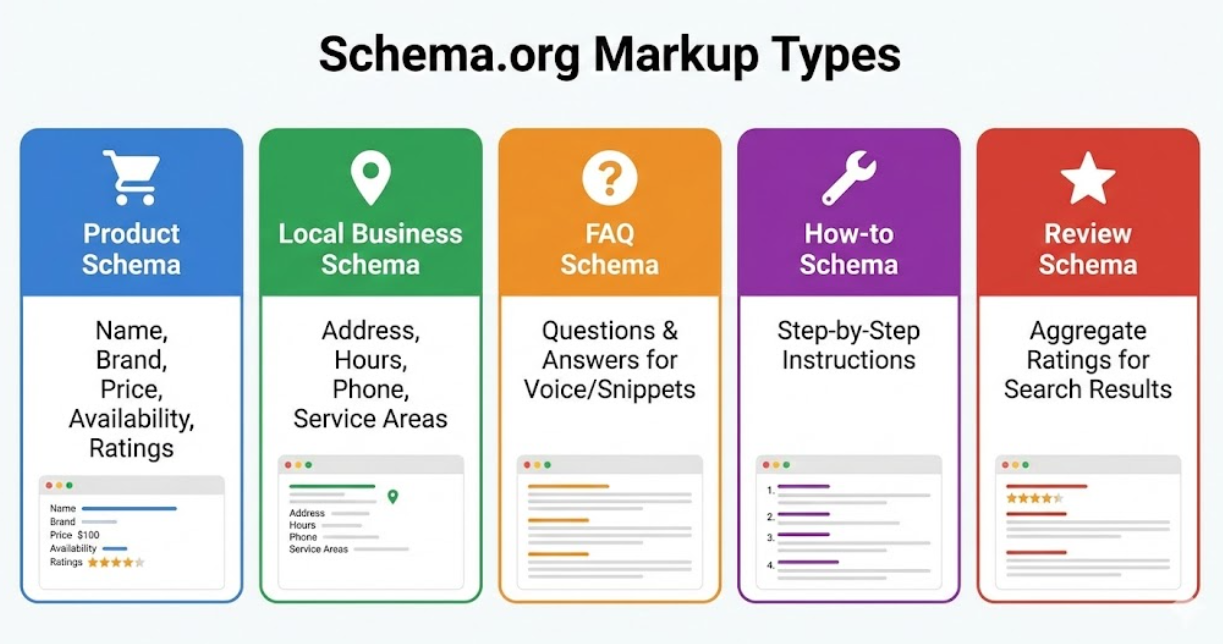 Schema.org markup provides standardized vocabulary describing content meaning beyond what human-readable text conveys. Product schema includes name, brand, price, availability, ratings, and specifications enabling shopping assistants to present accurate information. Local business schema provides address, hours, phone, and service areas helping voice assistants recommend appropriate businesses. FAQ schema marks questions and answers for excerpt in voice responses and featured snippets. How-to schema outlines step-by-step instructions voice assistants can narrate. Review schema aggregates rating data displayed in search results and used by recommendation algorithms.