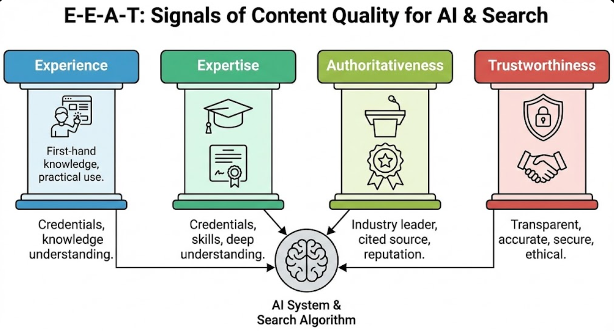 AI search optimization guidelines emphasize that content demonstrating clear E-E-A-T receives preferential treatment both in traditional search rankings and as source material for AI-generated answers.