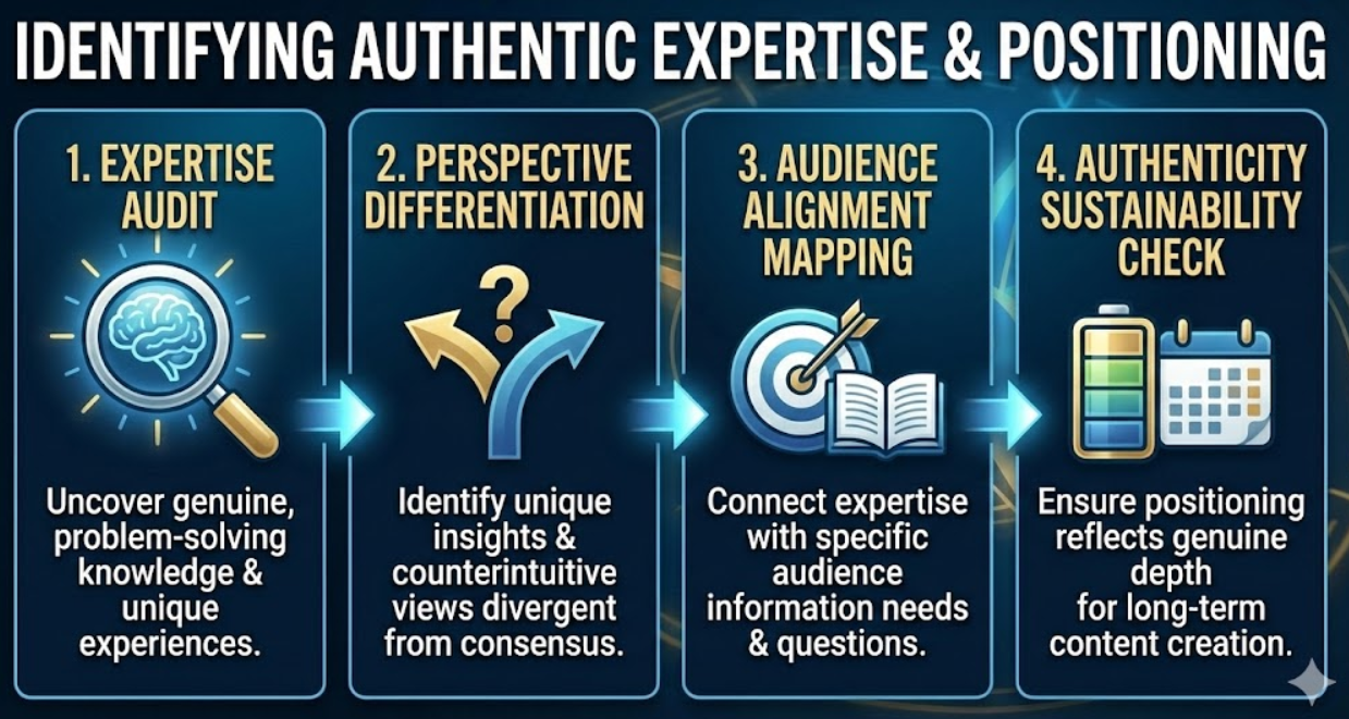 Expertise audit identifies authentic authority foundations. Examine executive's career experience identifying problems repeatedly solved, industries deeply understood, approaches that consistently deliver results, and perspectives differing meaningfully from mainstream consensus. Genuine thought leadership emerges from this authentic expertise intersection—not from identifying what seems impressive but from documenting what the executive actually knows better than most. Authenticity audit questions include: What do clients most frequently seek this executive's specific opinion on? What questions can this executive answer that most peers couldn't? What experiences have shaped perspectives unavailable without similar history?