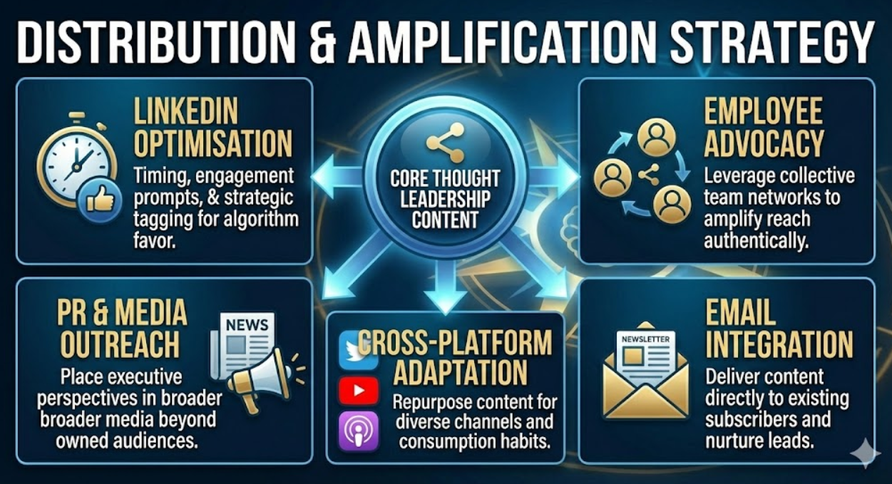 Creating excellent thought leadership content without strategic distribution reaches minimal audiences, requiring systematic amplification transforming published pieces into widespread visibility.