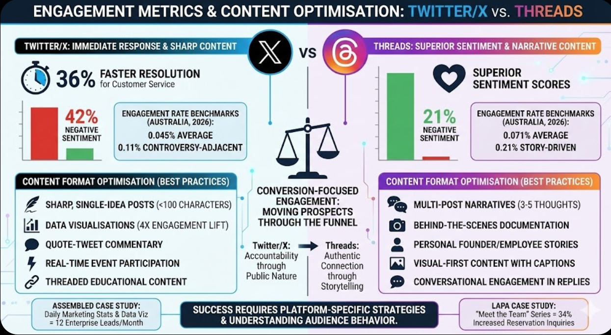 However, sentiment analysis from Australian social media monitoring reveals concerning patterns. Brand mentions on Twitter/X average 42% negative sentiment versus 21% on Threads. The platform's confrontational culture means dissatisfied customers broadcast complaints more aggressively.