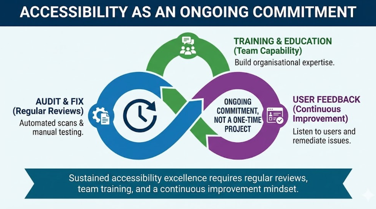 Accessibility requires ongoing commitment rather than one-time compliance project, with organisational processes ensuring sustained accessibility excellence.
