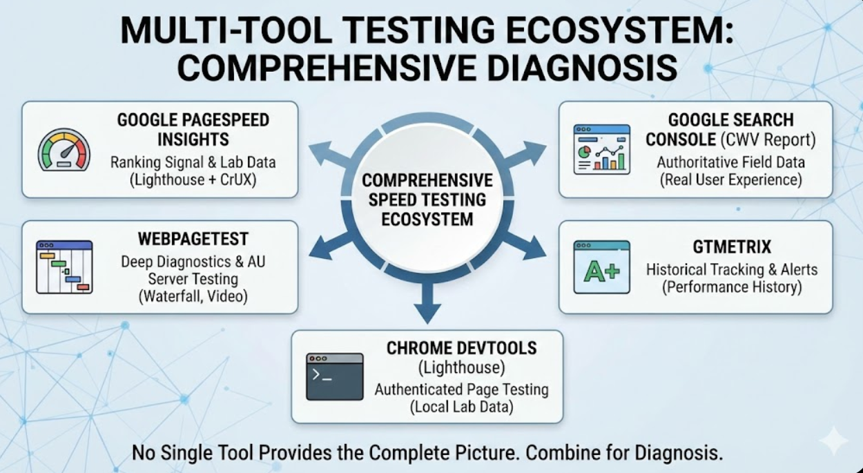 - Speed testing requires multiple tools measuring different performance dimensions—no single tool provides complete performance picture, making tool combination essential for comprehensive diagnosis