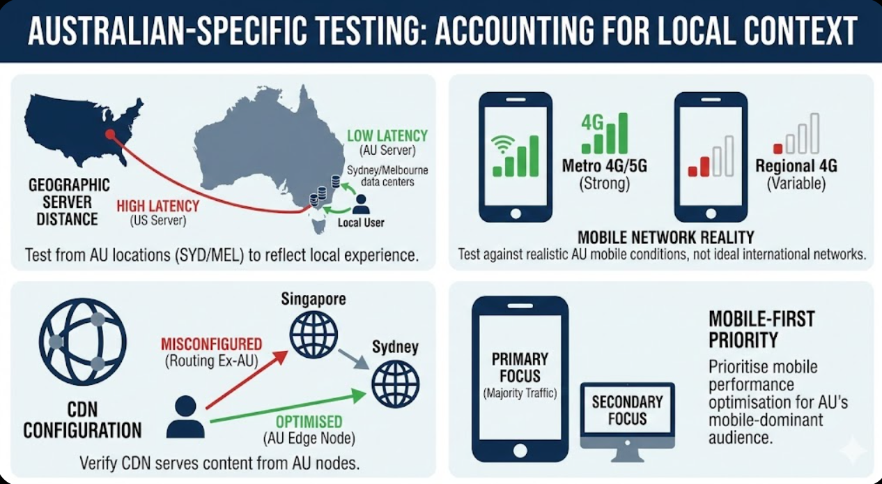 - Australian website testing must account for geographic server distance affecting load times for local audiences—testing from Australian server locations produces meaningfully different results from US or European testing that international tools default to