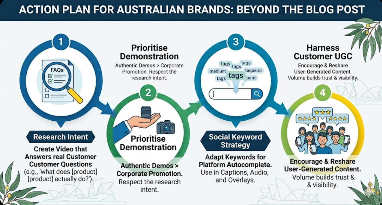 Genuine demonstration over promotion. Social search users are specifically trying to avoid promotional content. A business that produces content that is unmistakably promotional performs poorly in social search relative to content that demonstrates, shows, explains, or reveals in a way that respects the viewer's research intent. The most effective social search content for Australian brands is the content that provides the information a potential customer needs to make a decision, presented in a format that feels like a recommendation from a trusted source rather than an advertisement.