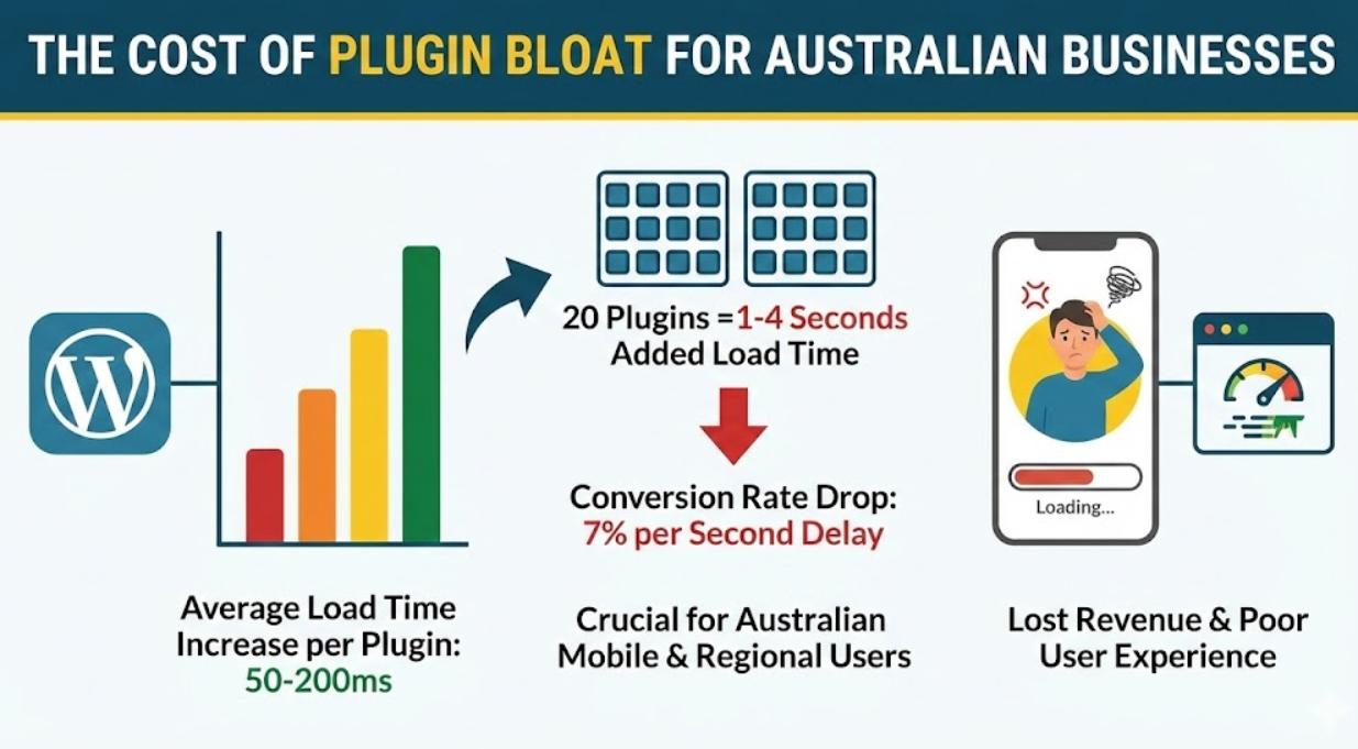 Research shows each plugin adds an average page load time of 50 to 200 milliseconds. That doesn't sound like much until you multiply it across 20 plugins, adding 1 to 4 seconds of load time. Given that conversion rates drop 7% for every additional second of load time, bloat directly costs revenue. Australian businesses particularly feel this impact. With increasing mobile traffic and varying connection speeds across regional areas, every millisecond of bloat matters for user experience and search rankings.