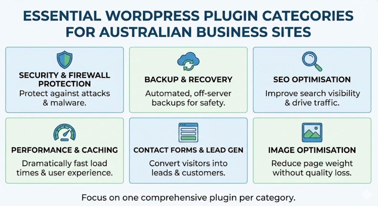 Q: What are the absolute essential WordPress plugins every Australian business website needs in 2026?Essential plugins vary by business type, but most Australian business sites benefit from these categories: security protection (Wordfence or Solid Security for firewall and malware scanning), backup solutions (UpdraftPlus or BackupBuddy for automated backups), SEO optimisation (Rank Math or Yoast SEO for search visibility), performance caching (WP Rocket or LiteSpeed Cache for speed), and form functionality (WPForms or Gravity Forms for contact and lead generation). E-commerce sites require WooCommerce plus payment gateway integrations. Beyond these core categories, evaluate plugins based on specific needs. Many businesses add unnecessary plugins for features already included in quality themes or achievable through simple code snippets. Before installing any plugin, check if your theme includes the functionality, search for lightweight alternatives, verify active maintenance and positive reviews, and test performance impact on a staging site. Remember that premium plugins often consolidate features requiring multiple free plugins, potentially reducing total plugin count whilst improving performance and support quality.