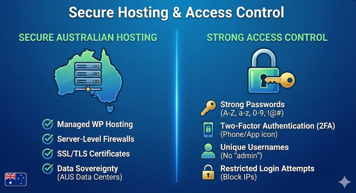 Australian hosting location provides specific advantages for Australian businesses. Data sovereignty keeps customer information within Australian jurisdiction under Australian privacy laws. Lower latency improves site speed for Australian visitors. Australian-based support operates in compatible time zones. Hosting providers like VentraIP, Digital Pacific, Panthur, and Crazy Domains offer Australia-based WordPress hosting with security focus.