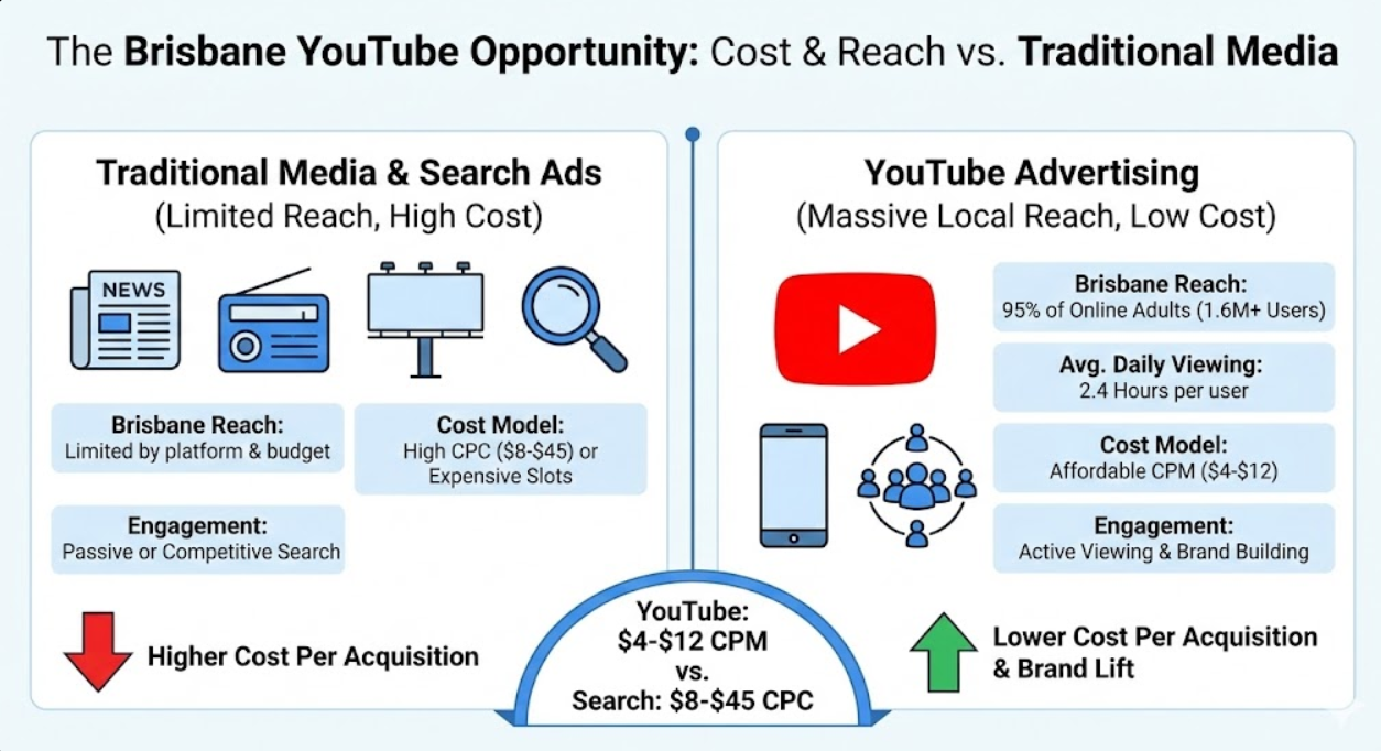 - YouTube reaches 95% of Brisbane online adults with average 2.4 hours daily viewing, creating massive local advertising opportunity at $4-$12 CPM versus $8-$45 CPC for search advertising