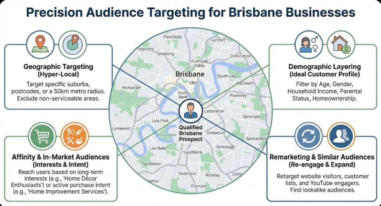 Strategic audience targeting concentrates impressions on qualified Brisbane prospects rather than wasting budget on irrelevant national or international viewers.