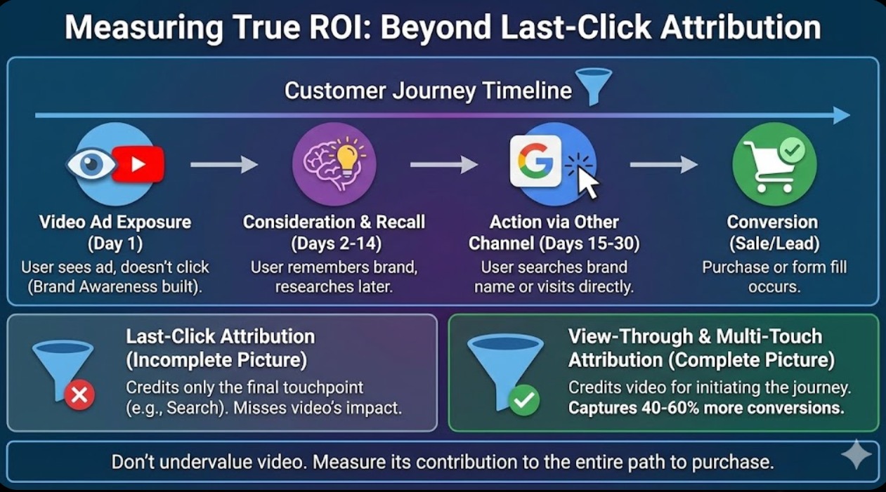- YouTube converts beyond direct clicks through 40-60% view-through conversion rates where users see ads without clicking but later convert through search or direct traffic, requiring sophisticated attribution capturing full value